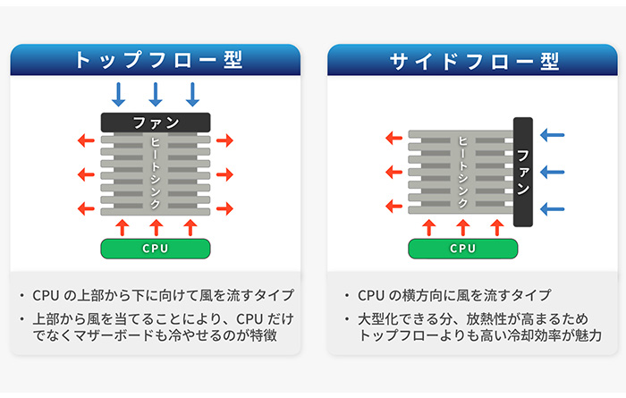 さらに、空冷CPUクーラーは、風を送る向きで「トップフロー型」「サイドフロー型」の2種類に分けられます。