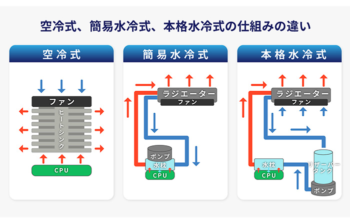 | 項目 | 空冷式 | 簡易水冷式(AIO) | 本格水冷式 |