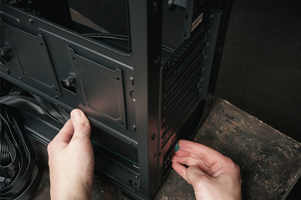 ケーブルが他のパーツと干渉しないよう、ケース内部の側面や裏面に沿わせてまとめると安全です。余ったケーブルは結束バンドで数本ずつまとめ、ケース内の固定用フックやケーブルホールに通して固定します。