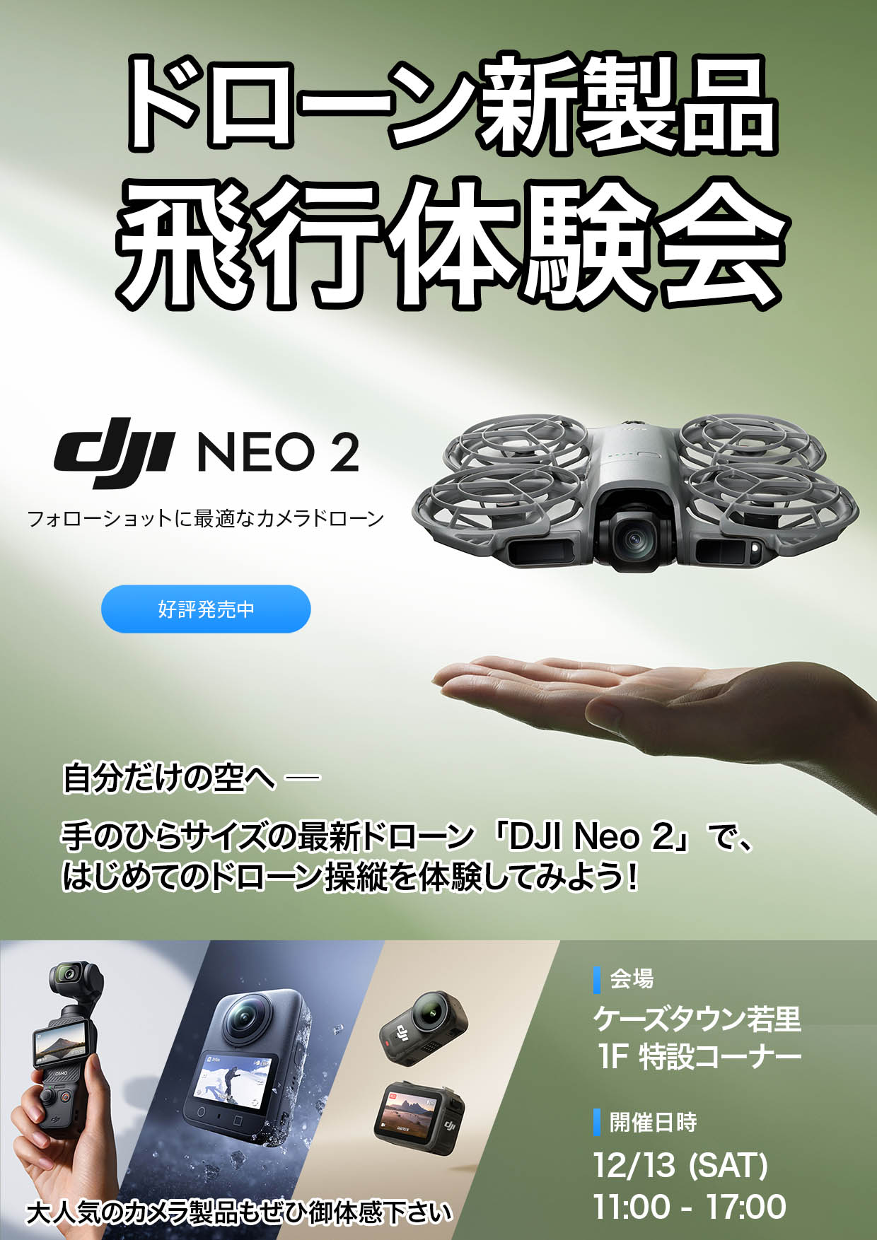 DJIの軽量コンパクトなドローン「DJI Neo 2」と最新アクションカメラの体験会を12/13(土) ケーズデンキ長野本店にて開催!