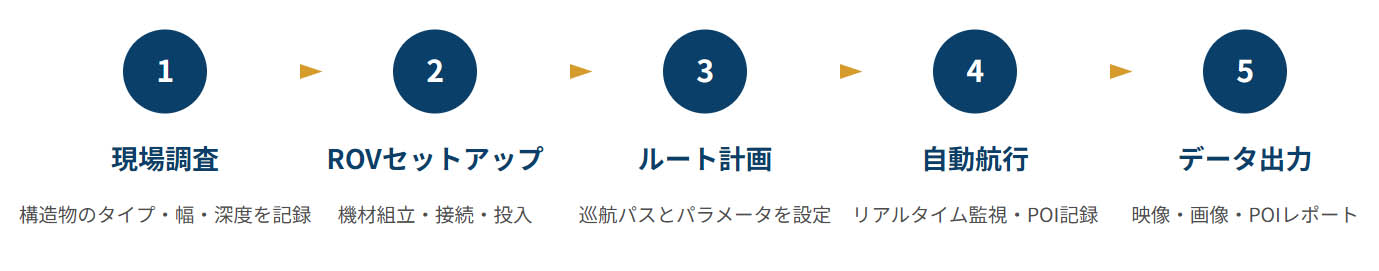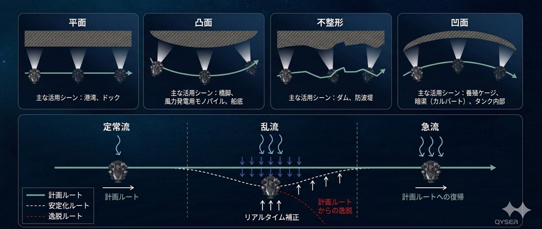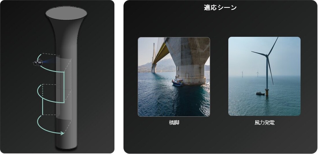 ドローンが実現している壁面点検のための立面航行と同じ概念を、GPS信号の届かない水中環境で音響センサーと慣性航法を組み合わせて実現した、業界革新のソリューションです。