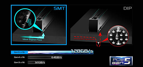 従来のDIPスタイルのPCIeスロットと比較して、SMT(表面実装技術)タイプのPCIe スロットは、信号の流れを改善し高い速度と安定性を発揮。