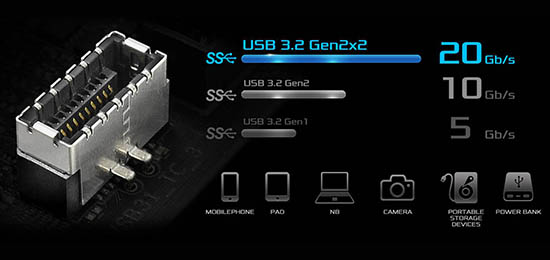 最大 20 Gbps の USB 3.2 Gen2x2 Type-C のフロントパネル用ヘッダーを搭載。