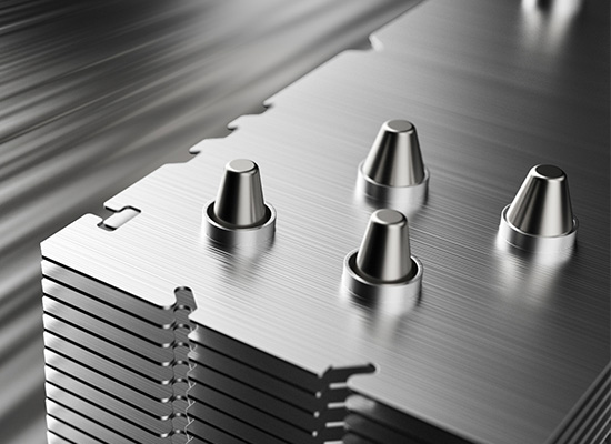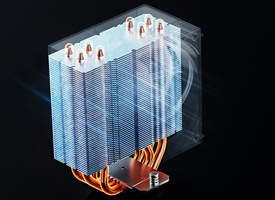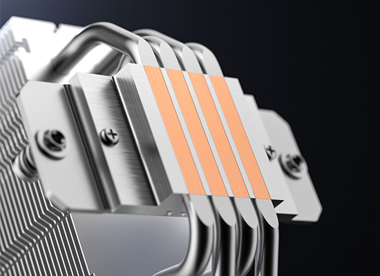 熱伝導性を最大化する4本の先進ヒートパイプが、熱を冷却フィン上の最適位置へ伝達。成熟したフィン貫通技術によりヒートパイプへ圧入されたフィンは、熱抵抗を最小限に抑えながら最高の冷却性能を実現します。