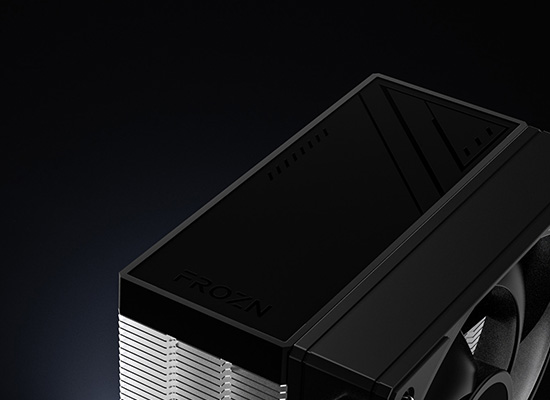 ナチュラルなアルミ表面、プラスチック製トップキャップ、マット調耐熱ステッカー「FROZN」の組み合わせが、一見してステルス感のある外観を実現。ヒートパイプのはんだ付け端部はトップカバーで隠され、あらゆるPC環境にシームレスに溶け込み、性能と外観の両方を際立たせます。