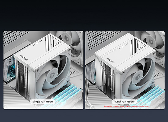 非対称構造によりメモリスロットを遮らず、スペースを節約。FROZN A410 SEはシングルファン/デュアルファンモードともに、コンパクトPCケースの限られた空間内でも全RAMモジュールとの互換性を確保します。