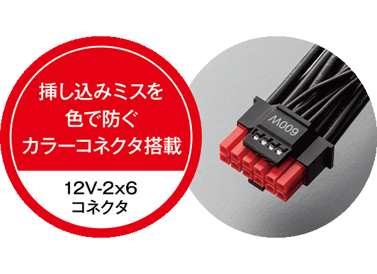 挿し込みが浅いことでトラブルになりやすい16ピン電源コネクター(12V-2x6)に、カラーコネクターを採用しました。