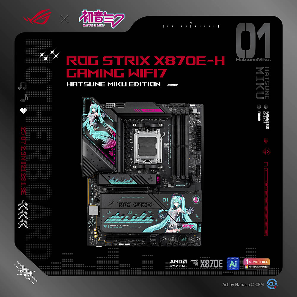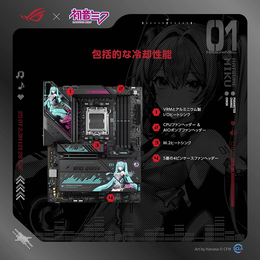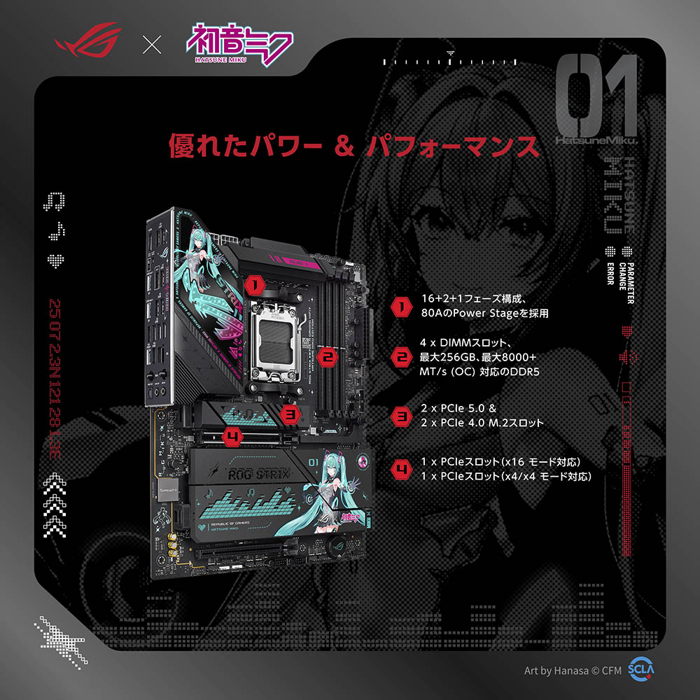 ROG Strix X870E-H Gaming WiFi7 Hatsune Miku Editionを使ってゲーミング体験を革新しましょう。AMD Ryzen™ 9000シリーズプロセッサを搭載したこのATXマザーボードは、最先端の電源設計、AI強化機能、次世代コネクティビティを組み合わせ、PCIe® 5.0 x16スロット、デュアルUSB4® Type-Cポート、WiFi 7に対応します。DIYフレンドリーで、4つのM.2スロットすべてにM.2 Q-Release、PCIeスロットQ-Releaseを搭載し、アップグレードが簡単です。さらに、ミクの象徴的なカラーとグラフィックがマザーボードのデザインに完全に統合され、独特のエネルギーと個性をお使いのPCにもたらします。
