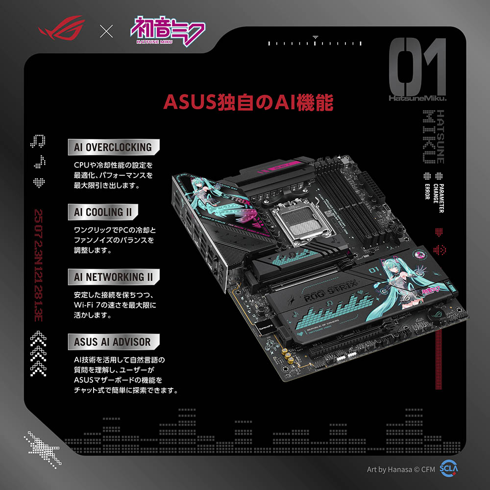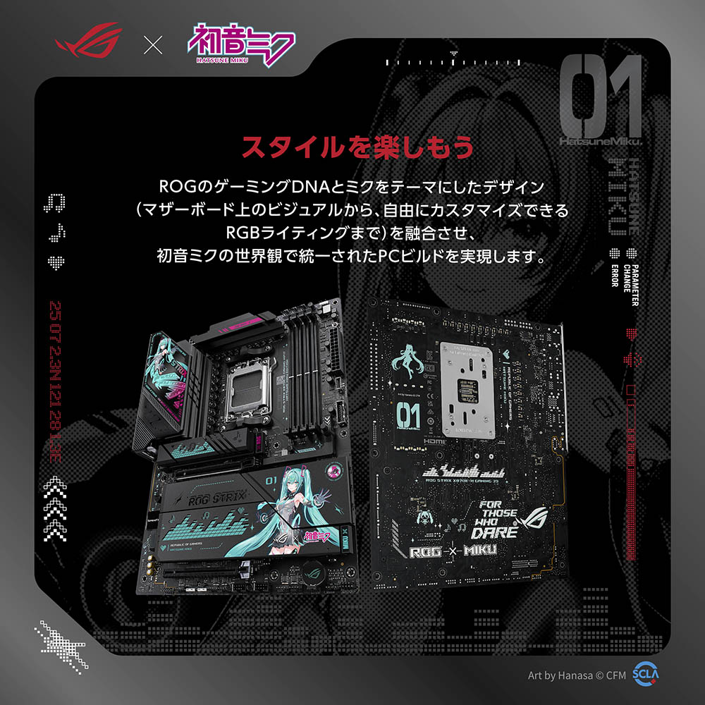 ROG Strix X870E-H Gaming WiFi7 Hatsune Miku Editionは、ROGのゲーミングDNAとミクの象徴的な青緑とピンクのカラーパレットを融合させたモデルです。様々なヒートシンクや背面も含めマザーボード全体にミクをテーマにしたビジュアルが施されています。BIOSインターフェイスとArmoury Crateソフトウェアにもミクをモチーフにしたビジュアルが採用されています。Armoury Crateを通じ、ユーザーはRGBライティング効果をAura Sync経由でカスタマイズし、対応デバイス間で同期させて、統一感のあるミクテーマのPCを実現できます。
