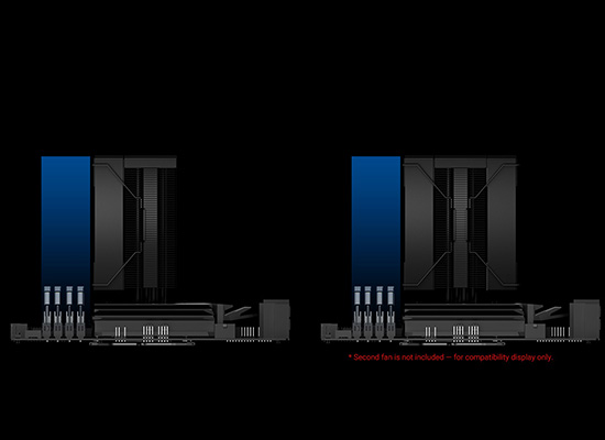 非対称設計によりメモリスロットとの干渉を防ぎ、スペース効率を最大限に高めます。シングルファン構成・デュアルファン構成のいずれにおいても、RAMモジュールの完全な互換性をサポートします。