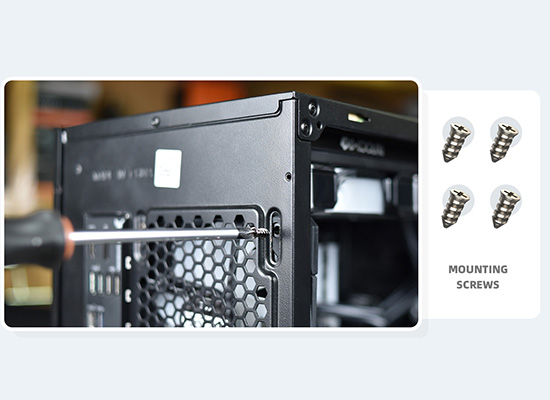 コンピューターケースへの固定用の取り付けネジが4本付属しており、しっかりと固定されます。