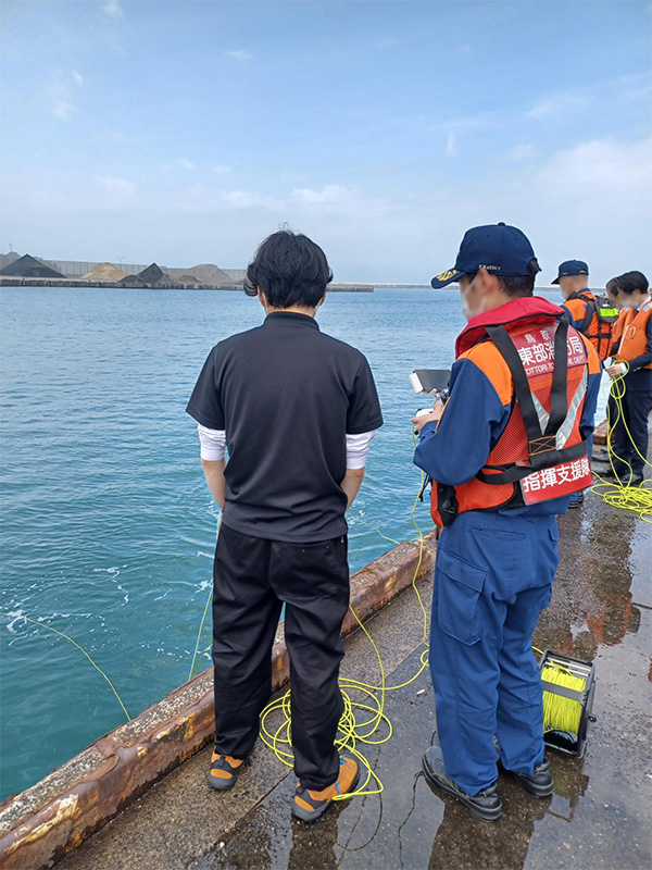 合同訓練では、要救助者を模したダミー人形を用いた水中での捜索活動を実施し、水難救助における水中ドローンの有効性を確認しました。