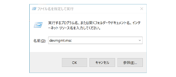 キーボードの[Windowsキー]+[Rキー]を押して表示されるダイアログに「devmgmt.msc」と入力してOKをクリックすると、デバイスマネージャが表示されます。