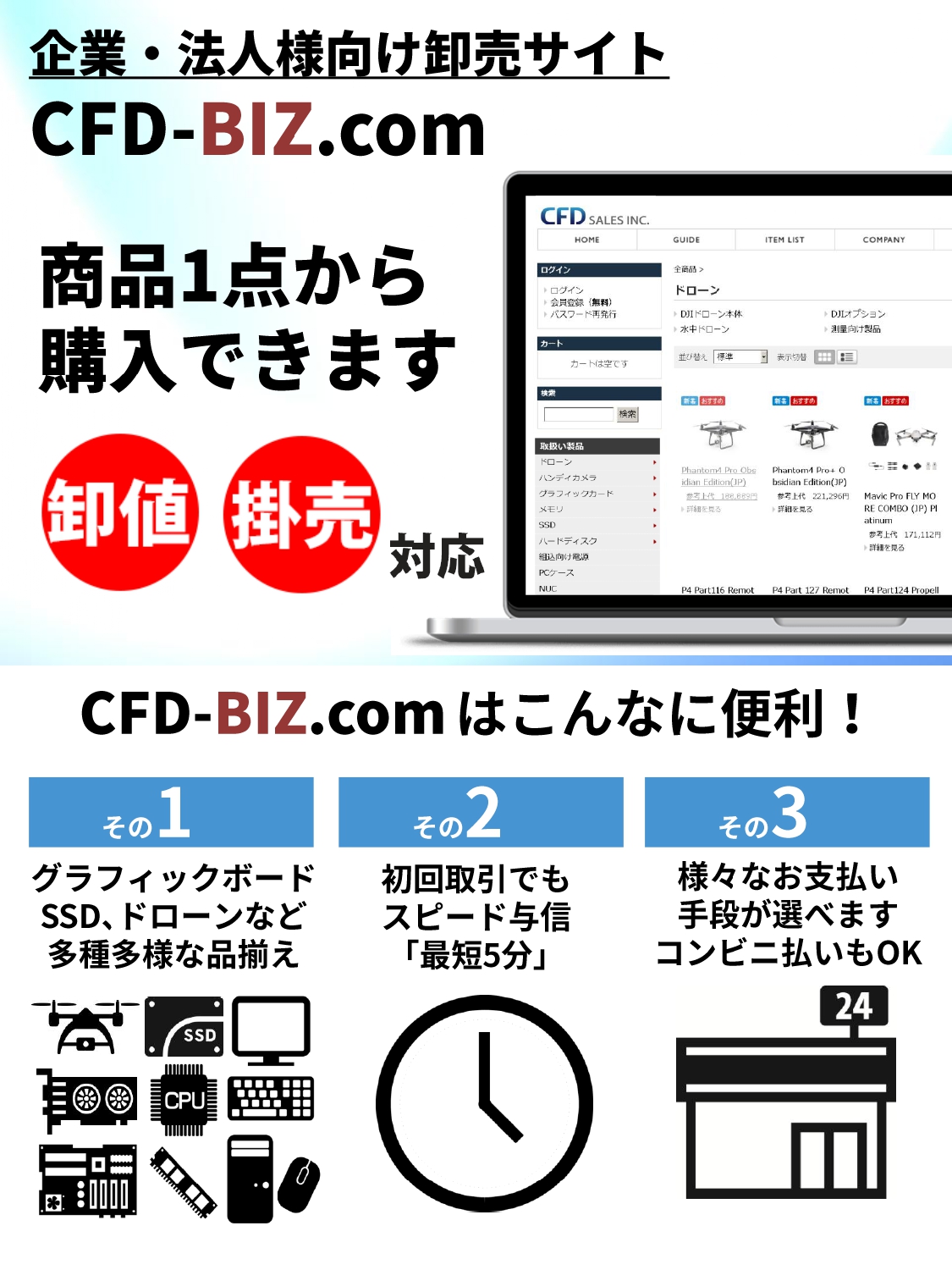 CFD-BIZ.comでは、PCパーツの総合サプライヤーであるCFD販売ならではの、グラフィックボード・SSDなどのPCパーツから、ドローン・映像編集機材など約1000アイテムを超える幅広い商品を取り揃えております。