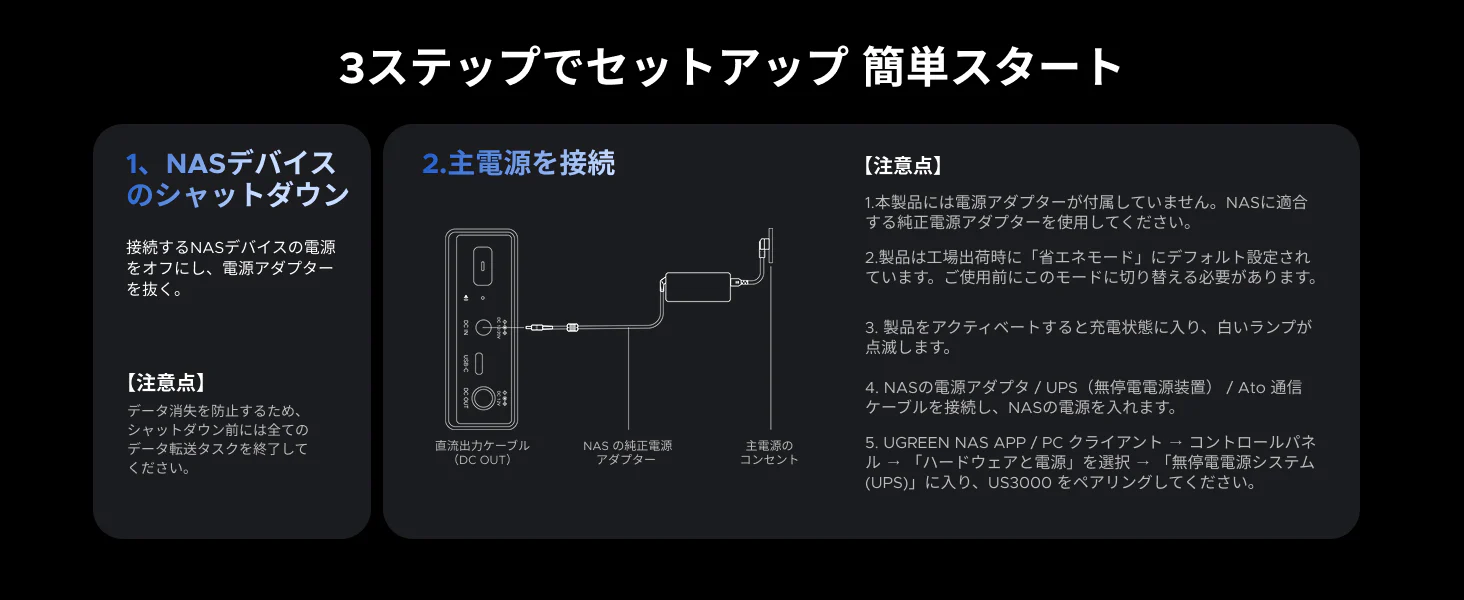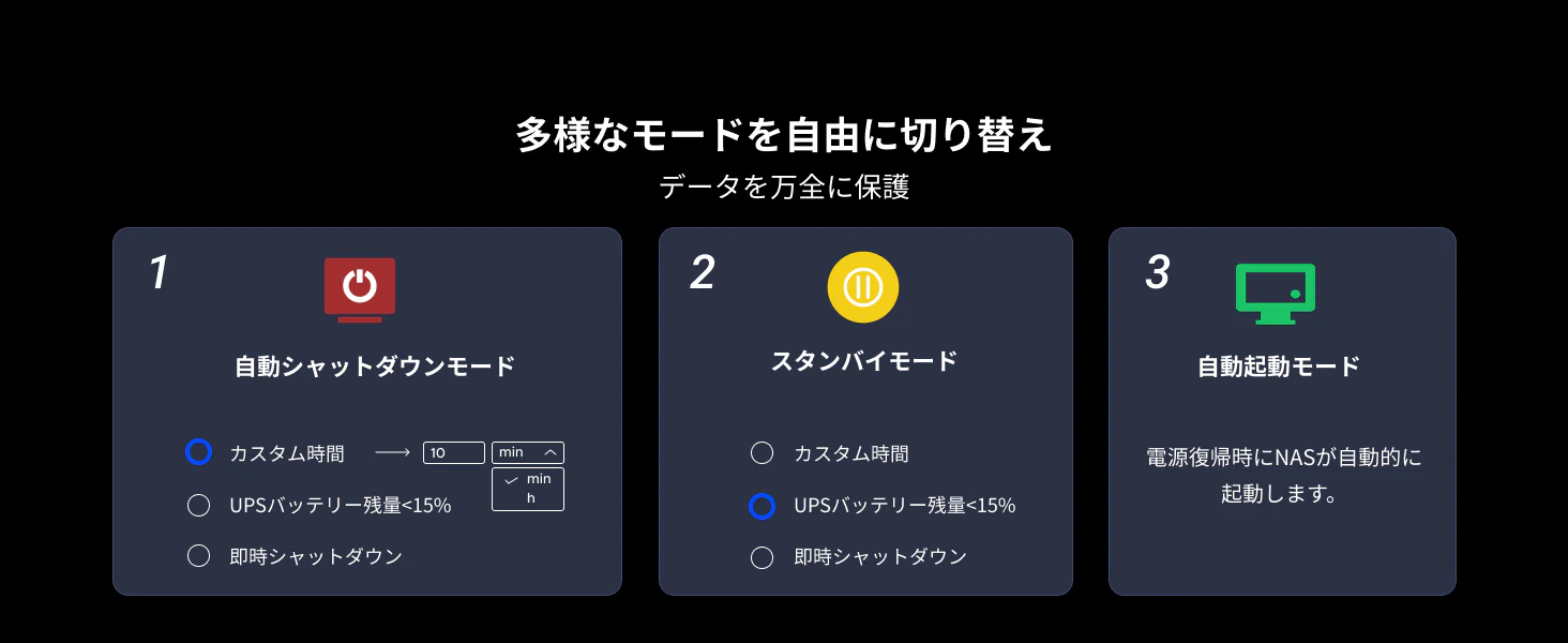 これにより、NASはデータの保存と安全なシャットダウンを行うための十分な時間を確保でき、データの整合性やハードドライブも適切に保護されます。