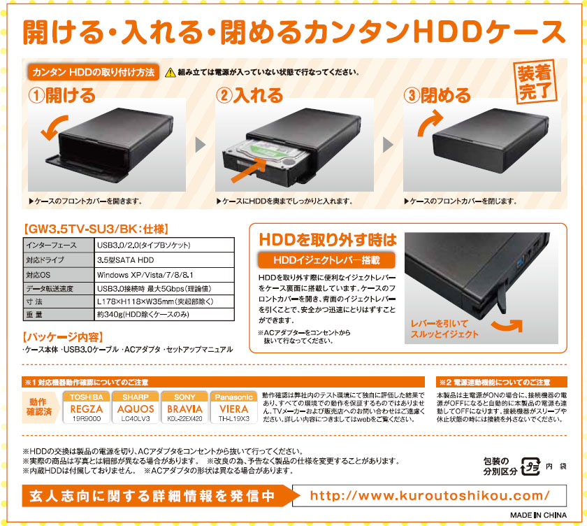 GW3.5TV-SU3/BK | USB3.0接続 3.5型 SATA HDDケース(ブラック)