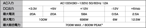 | 電源容量 | 700W(定格) / 800W(ピーク) | ||