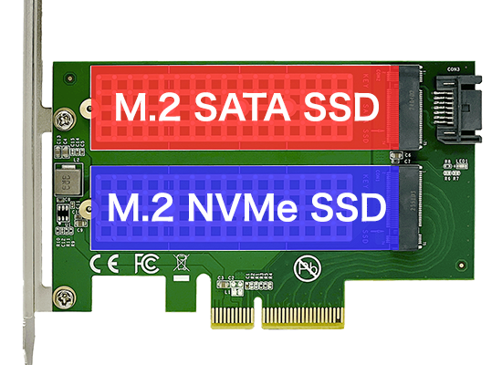 M.2 NVMe SSDをPCI Express x4に、M.2 SATA SSDをSATAポートに変換