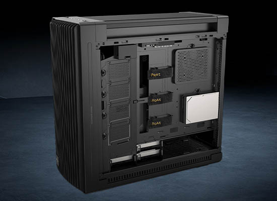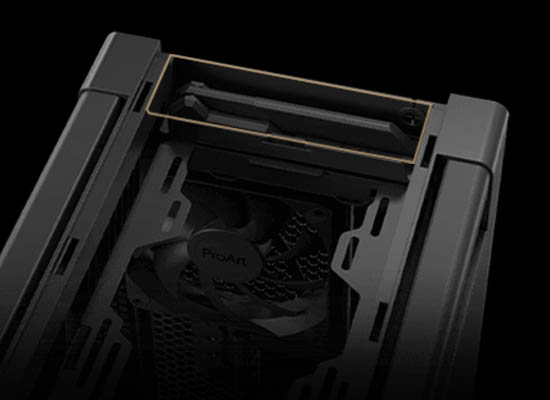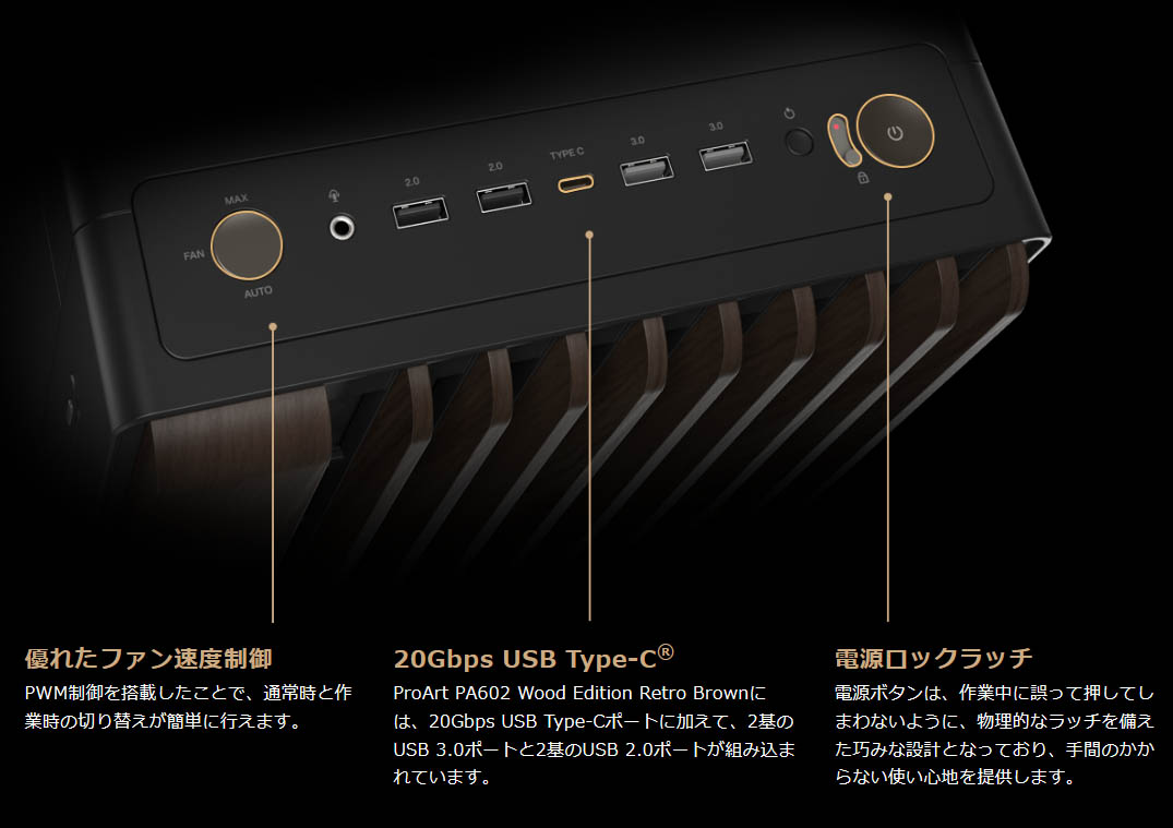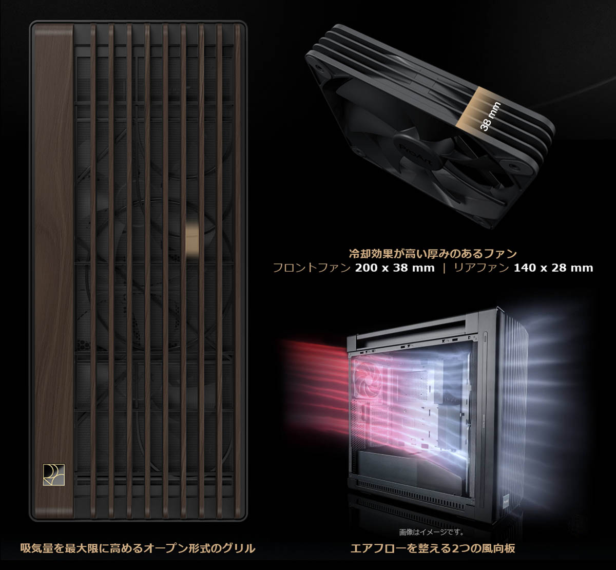 PA602 Wood Editionは、エアフローと換気を最大化するために、メッシュ構造のオープンフロントグリルを採用しています。また、極厚のPWMファンにより、非常に優れたエアフローと快適な静音性を実現し、あらかじめ取り付けられた2つの風向板が連動して、ビデオカードとCPUクーラーの吸気口の両方に冷気を集中させ、システム全体の冷却効率を高めます。