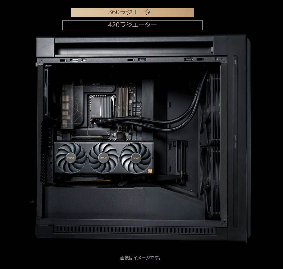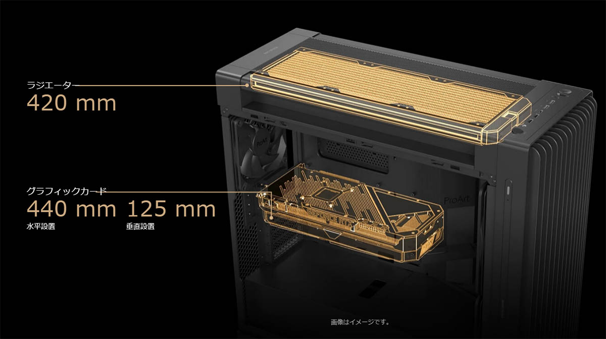 ProArt PA602 Wood Editionは、AIO冷却やカスタム液冷ループに使える420mmのラジエーターが1つ取り付けられます。ビデオカードも、水平または垂直に取り付けるための十分なスペースがあります。
