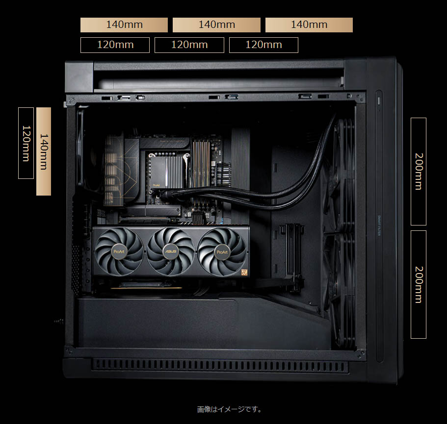 Front:200mm x2 TOP:140mm x3 / 120mm x3 Rear:140mm x1 / 120mm x1 プリインストールファン Rear:140mm x1 |