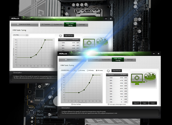 ASRock A-Tuning Fan-Tastic Tuning 機能により、ワンクリックで各ファンの最小負荷を自動検出できます。