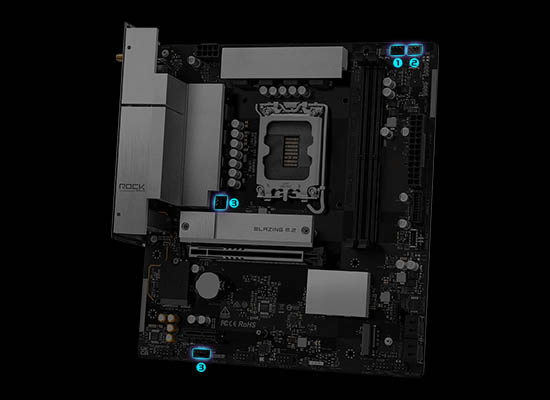 Blazing M.2 は、最新のPCI Express 5.0規格に対応し、前世代の2倍となる128 Gb/秒の転送速度に対応します。この驚異的な帯域幅により、将来の超高速SSDの性能を最大限に引き出すことができます。