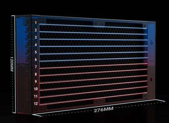 276×120×27mmの厚みを持つラジエーターは、フィンスタックの増設と12水路の採用により冷却表面積を37%拡大し、放熱性能と液容量を向上させました。300ワットの放熱能力を備え、最適な温度維持だけでなく、熱心なユーザーが過酷なオーバークロックセッションに挑戦する柔軟性も提供します。