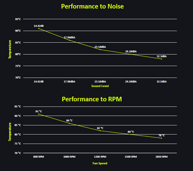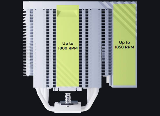 最大 1850 RPM 動作時でも、総合騒音値はわずか 32.5 dBA。冷却性能は最大 280W TDP に達します。