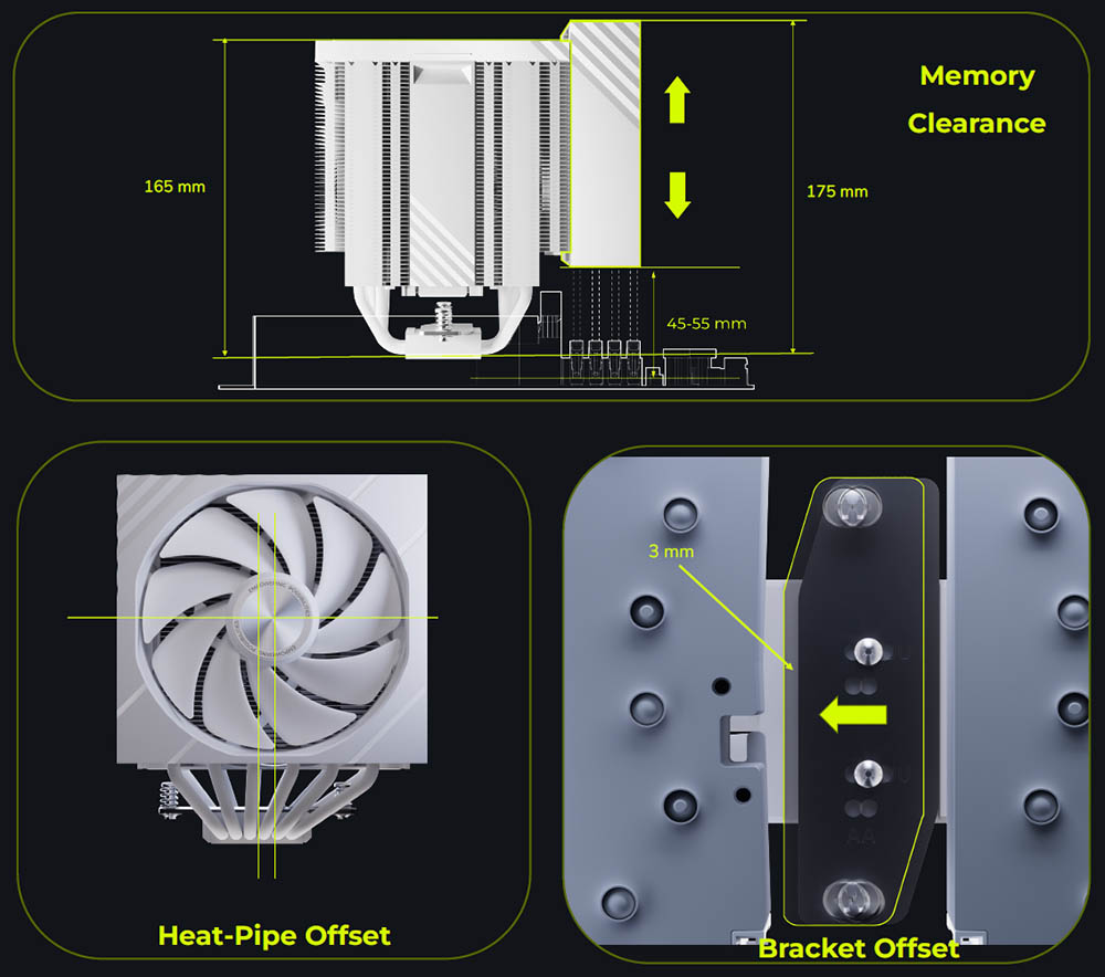 ヒートシンクは意図的に上方向へオフセット配置されており、ほぼすべてのマザーボードで主要な PCIe x16 スロットを完全に解放します。