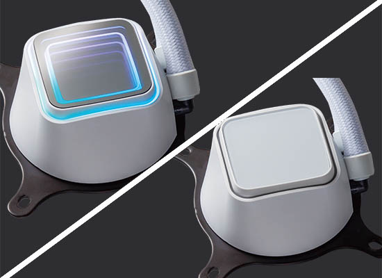 ホワイトカラーモデルの「KURO-AIOWC360L/V2/WHITE」「KURO-AIOWC240L/V2/WHITE」はポンプヘッドのインフィニティーミラーキャップを落ち着いた白基調のマットタイプに交換が可能です。