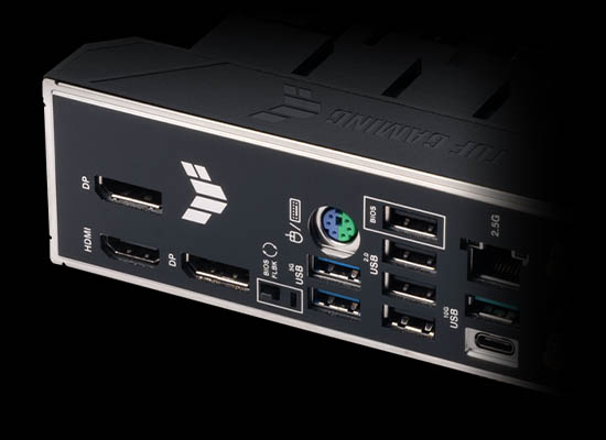 TUF GAMING マザーボードは、耐腐食性に優れた ステンレススチール製バック I/O パネルを採用しており、クロム酸化物との結合により、従来のパネルと比べて 3 倍の寿命を実現しています。