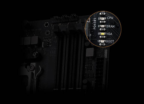 オンボードの Q‑LED トラブルシューティングランプは、起動時に CPU、メモリ、グラフィックスカード、ストレージデバイスといった主要コンポーネントが正常に動作しているかを、素早く確認できます。