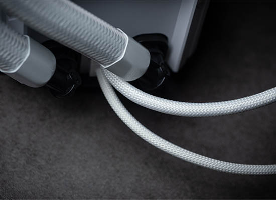 LCDとポンプヘッダー用の編組ケーブルは従来よりしなやかで、ケーブルマネジメントがより便利になっています。