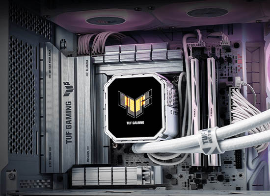 TUF Gaming LC III 360 ARGB LCD White Editionは、アニメーションやハードウェア情報、オリジナルコンテンツを表示することができる2.8インチIPS LCDを搭載し、ゲーミングPCの中心的存在です。効率的なポンプと取付済みのARGBファンがシステムの熱を効果的に制御し、安定したゲーミングパフォーマンスを実現します。