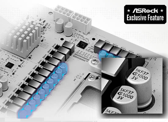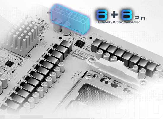 ASRock 高密度電源コネクタは、従来の CPU および ATX 電源コネクタと比較して高い電流に耐えるように設計されており、より安定したシステムを実現し、激しいオーバークロック時の火災のリスクを軽減します。